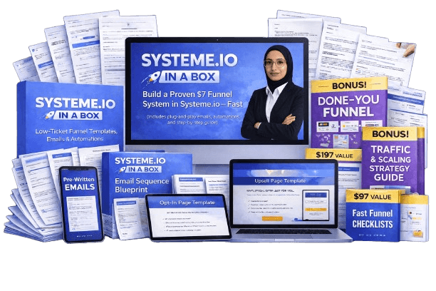 One Student used Systeme.io In A Box. After just a few hours, she launched a $7 low-ticket funnel with a $27 order bump, $97 upsell, and an affiliate offer page, and says it’s already helping her make sales on autopilot while growing her customer list.